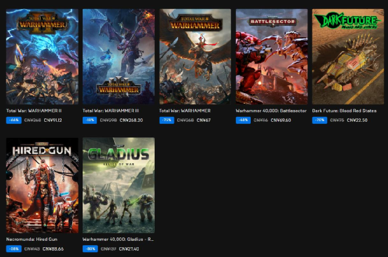 事实上,早在2018年开始,“战锤Skulls”活动就已经在Steam平台出现,之后每年都会如约而至。今年,这一活动的规模甚至推广到了Epic商城和微软商店,这些平台上的战锤IP游戏同样也在打折促销。