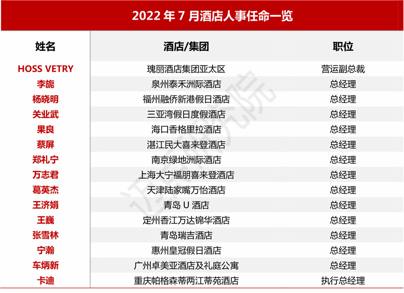酒店人事任命:据不完全统计,2022年7月共有35位高管履新,较上月有大幅提升。瑰丽酒店集团、洲际酒店、瑞吉酒店、希尔顿酒店、喜来登酒店、卓美亚酒店、文华东方酒店、香格里拉酒店等国际高端酒店人事变动较为频繁。一定程度上反映出在疫情稳定的窗口期,酒店集团通过人事和资源整合,进行管理变革和营销创新,努力实现更好的运营绩效。