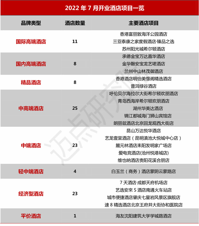 品牌酒店开业:据迈点不完全统计,2022年7月新开业103家酒店,类型横跨全品类,并以中高档为主。在酒店类型占比上,中高端酒店数量最多,为25家,其次是中端酒店和经济型酒店,均为23家。高端酒店和精品酒店赛道上,酒店定位及以度假型为主,精品酒店主要集中在西南和东部沿海地区。经济型酒店开业品牌以产品升级迭代类为主,反映出品牌的创新求变,不断把握投资管理市场需求能力的提升。