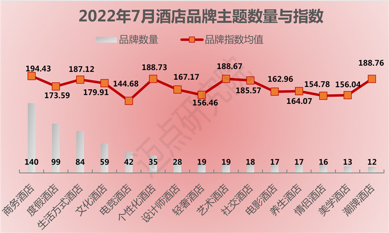 据迈点研究院数据显示,2022年7月总榜单酒店主题数量分布中,商务酒店占比最多,多达140个,潮牌酒店占比最少,为12个。品牌指数均值来看,商务酒店不仅品牌数量最多,品牌指数也拔得头筹,均值为194.43;电竞酒店品牌指数均值最低,为144.68,品牌影响力仍在培育期。从品牌指数的环比变化来看,美学酒店下降幅度最大,为-15.66 %;潮牌酒店上升幅度最大,为18.51%。