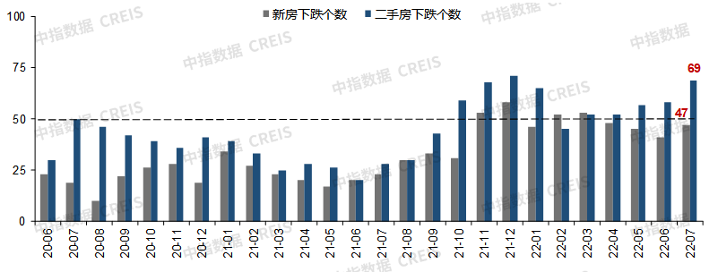 图:2020年6月至2022年7月百城新建及二手住宅价格环比下跌城市数量