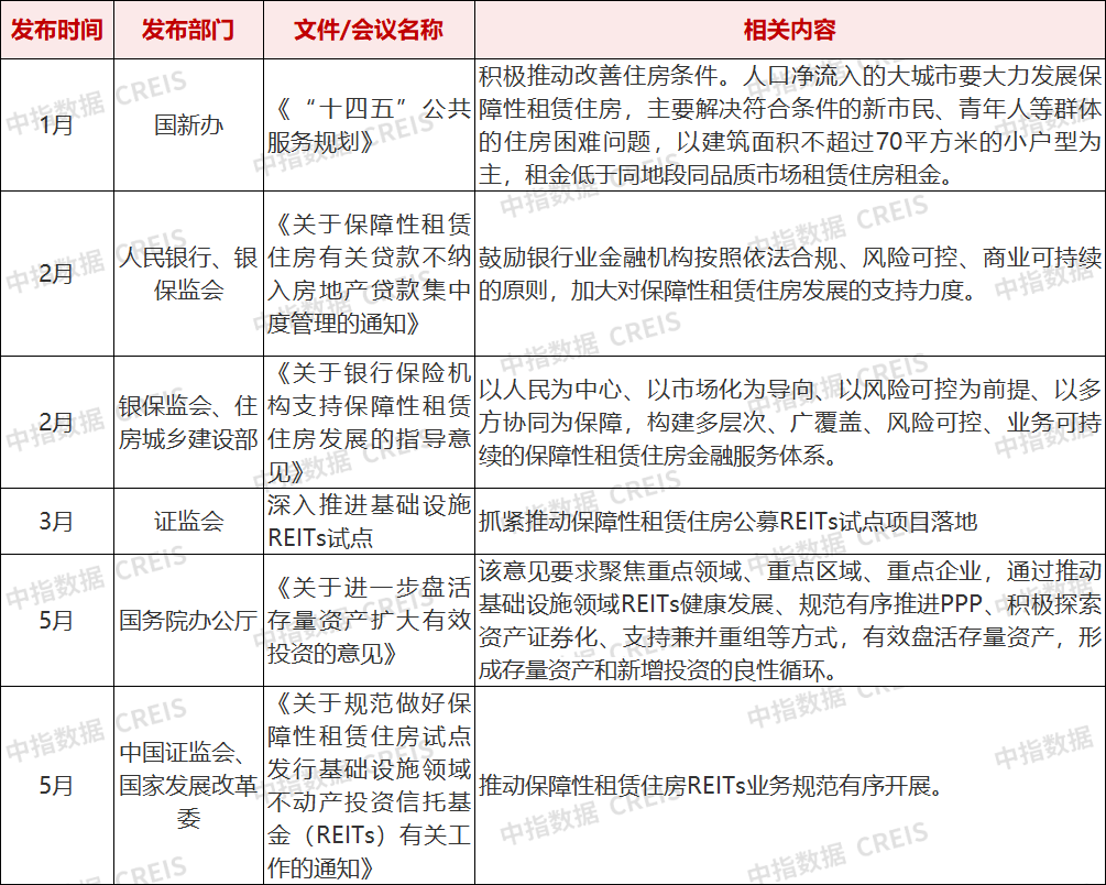 从国家层面来看,以金融、税收支持为主。2021年7月,国务院办公厅印发《关于加快发展保障性租赁住房的意见》,强调加快建设保障性租赁住房;2022年来,证监会、国家发改委、住建部等多个部门先后发文,在金融、财政、税费等重点领域加强对住房租赁市场的政策支持。尤其是体现在对住房租赁金融发展的支持力度,例如对REITs等融资支持的进一步释放,大大拓宽了保障性租赁住房建设的资金来源。