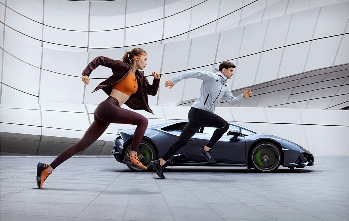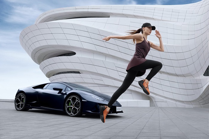 联名系列中的ENERZITE FLUID X AUTOMOBILI LAMBORGHINI专业跑鞋,受兰博基尼内饰设计启发,以碳纤维纹理装饰。碳纤维材料首先使用于F1赛车,之后是法拉利、兰博基尼等超跑的标配。