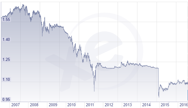 2008年金融危机爆发后,欧洲央行等主要央行实行的极度宽松政策引发了瑞郎汇率上行压力。由于担忧货币走强伤害本国经济,瑞士央行不得不花费大量瑞郎买入外汇(尤其是欧元)试图稳定汇率,结果造成外汇储备规模大幅增长。2015年1月15日,不堪重负的瑞士央行突然意外宣布取消欧元兑瑞郎1:1.2的汇率下限,同时将利率下调至-0.75%,引发了所谓“瑞郎黑天鹅”事件。