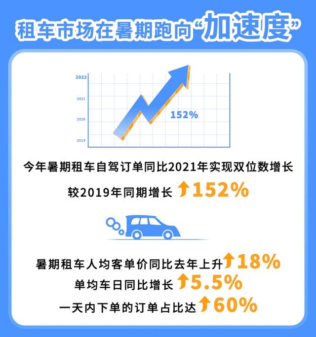 今年暑期租车自驾游迎来全年的“巅峰时刻”。携程租车数据显示,截至目前,暑期租车自驾游订单量已赶超去年,同比2021年实现双位数增长,较2019年疫情前增长152%。同时,因单订单平均租车时间延长,人均租车花费较去年实现18%的上涨。