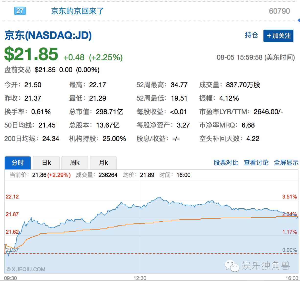 但与“情场得意”形成鲜明对比的是,京东的股票却一直萎靡: