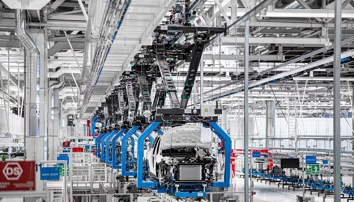 奔驰纯电平台EVA与燃油车架构上并不相通。公司的做法是用生产流管理系统(PFM)来实现同“线”不同车;同时在车身制造流程取消传统固定的生产线,转而用不同的“节点”来代表不同的制造流程;自动无人驾驶引导车(AGV)则负责在节点之间运输必要的生产组件。