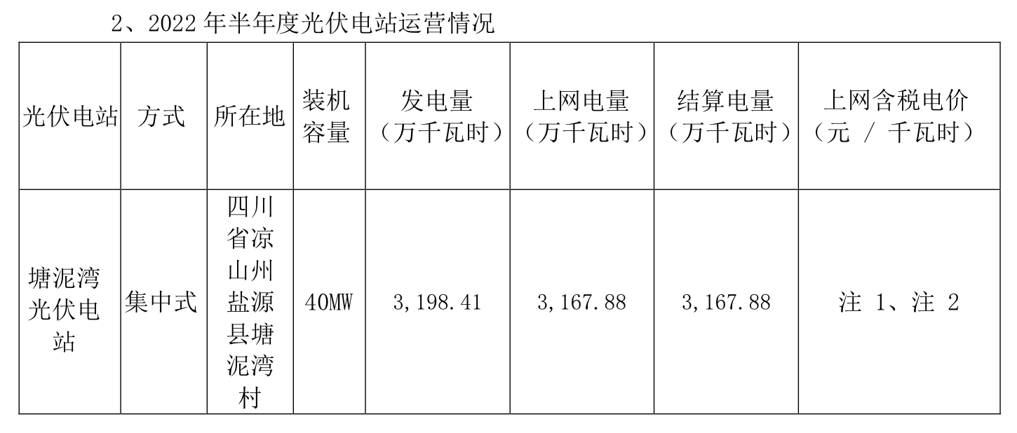 整体售电均价的话,2022年上半年为0.519元/千瓦时(含税),同比下滑了1.27%。至于光伏上网含税电价是由电网结算价和补贴两部分构成,2022年1-5月塘泥湾光伏电站上网结算含税电价为0.95元/千瓦时;6月上网结算含税电价为0.7588元/千瓦时。