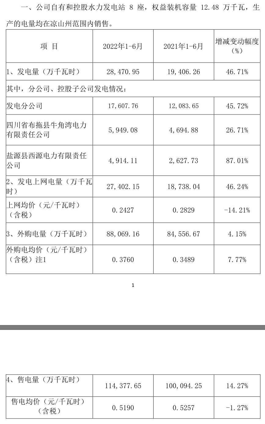 根据2022年上半年的经营数据,2022年上半年的上网均价为0.2427元/千瓦时(含税),较2021年上半年的0.2829元/千瓦时下降了14.21%;但外购电均价为0.376元/千瓦时(含税),较上年同期的0.3489元/千瓦时增长了7.77%。据公司表示,报告期外购电均价同比增长7.77%,主要是受四川省发展和改革委员会《关于明确四川省电网企业间临时结算方式有关问题的通知》(川发改价格〔2022〕36号)影响所致。