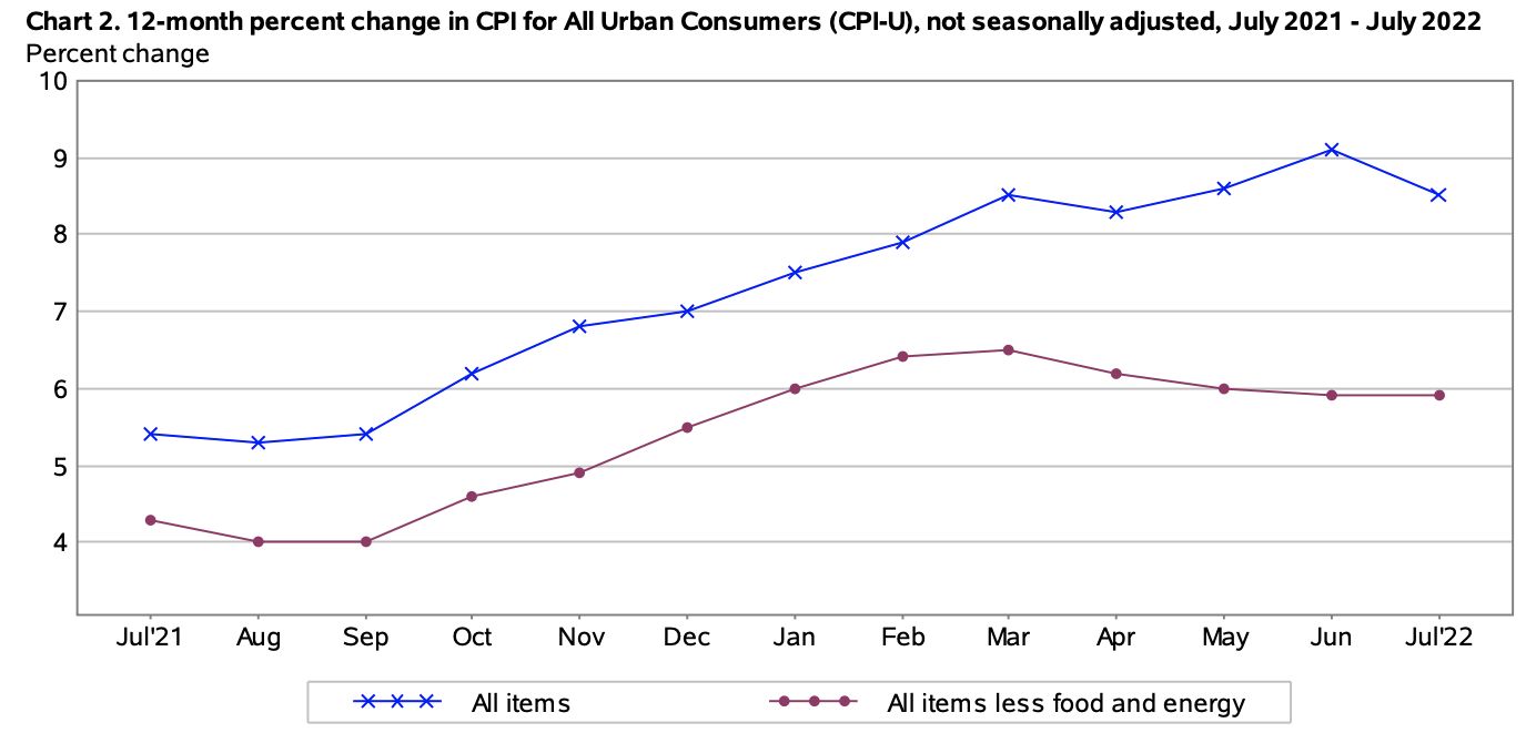 美东时间8月10日,美国劳工部公布的最新通胀数据显示,7月消费者价格指数同比增长8.5%,该数字虽然仍处于40年来高位,但较6月9.1%的前值已出现较大幅度下降。