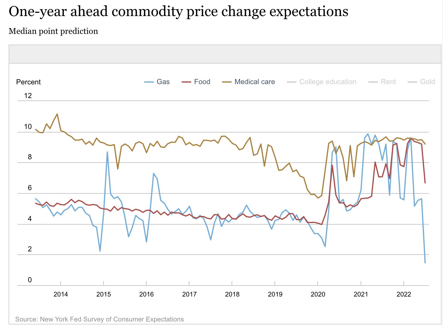 纽约联储8月8日的调查显示,美国消费者对于通胀的预期正在下降。7月受访者对于未来一年的通胀率预期中值为6.2%,该数字较6月的前值6.8%出现了较大幅度的下降。其中燃油项和食品项的年通胀预期下降幅度最大,分别从6月的5.6%和9.2%下降到1.5%和6.7%,食品项通胀预期的降速为2013年以来的极值。受访者当月对于未来三年和五年的通胀预期中值则分别为3.2%和2.3%,同样低于6月3.6%和2.8%的前值。