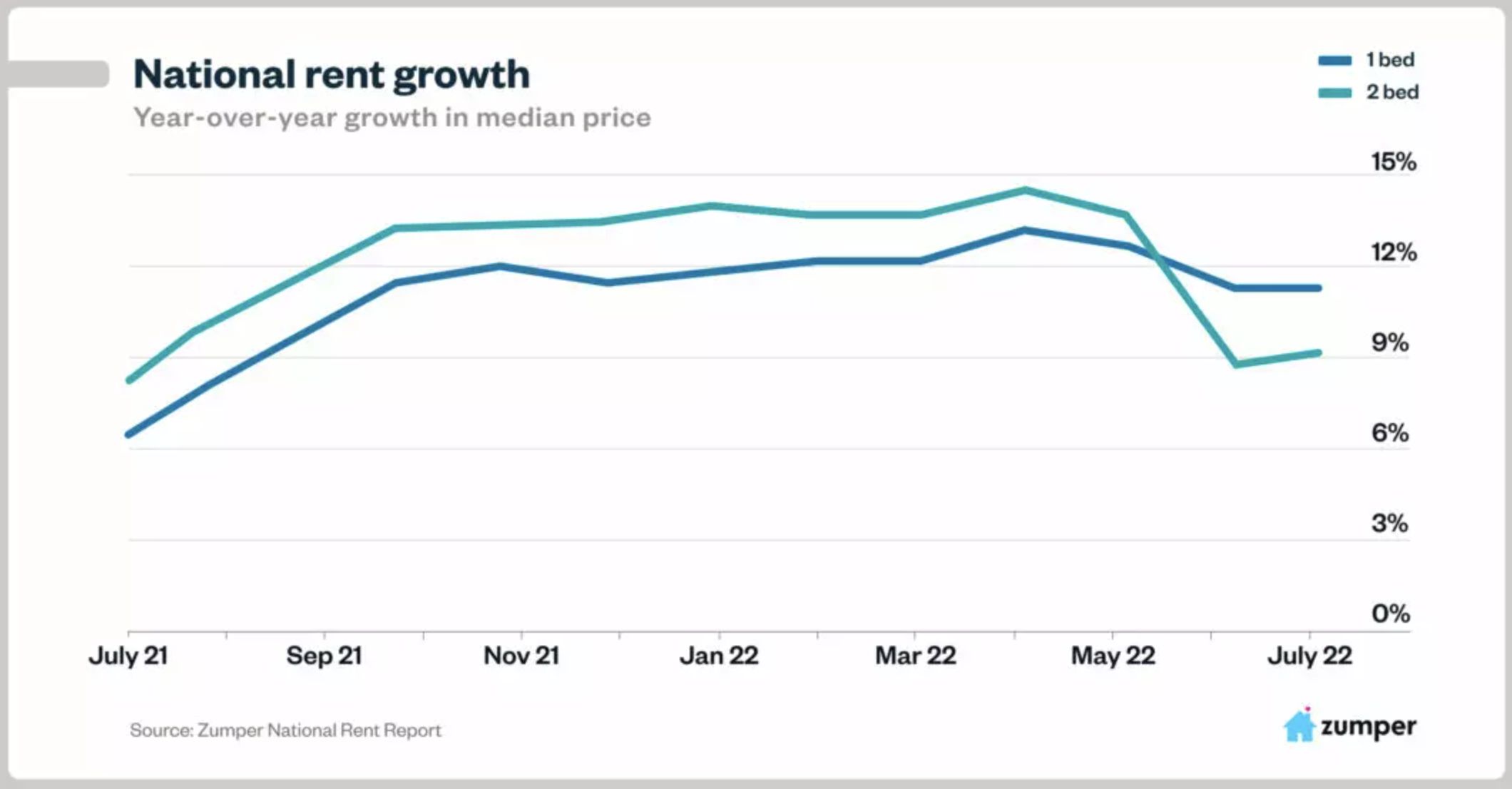 根据房地产租赁网站Zumper 7月26日的最新报告,全美租金中位数增速仍处于高位。其中一居室的月租金中位数为1450美元,环比增长2%、同比增长11.3%;两居室的月租金中位数为1750美元,环比增长2%、同比增长9.3%。纽约租金涨幅仍领跑全美各大城市,7月该市一居室的月租金中位数已高达创纪录的3780美元,环比增长5%、同比增长41%。