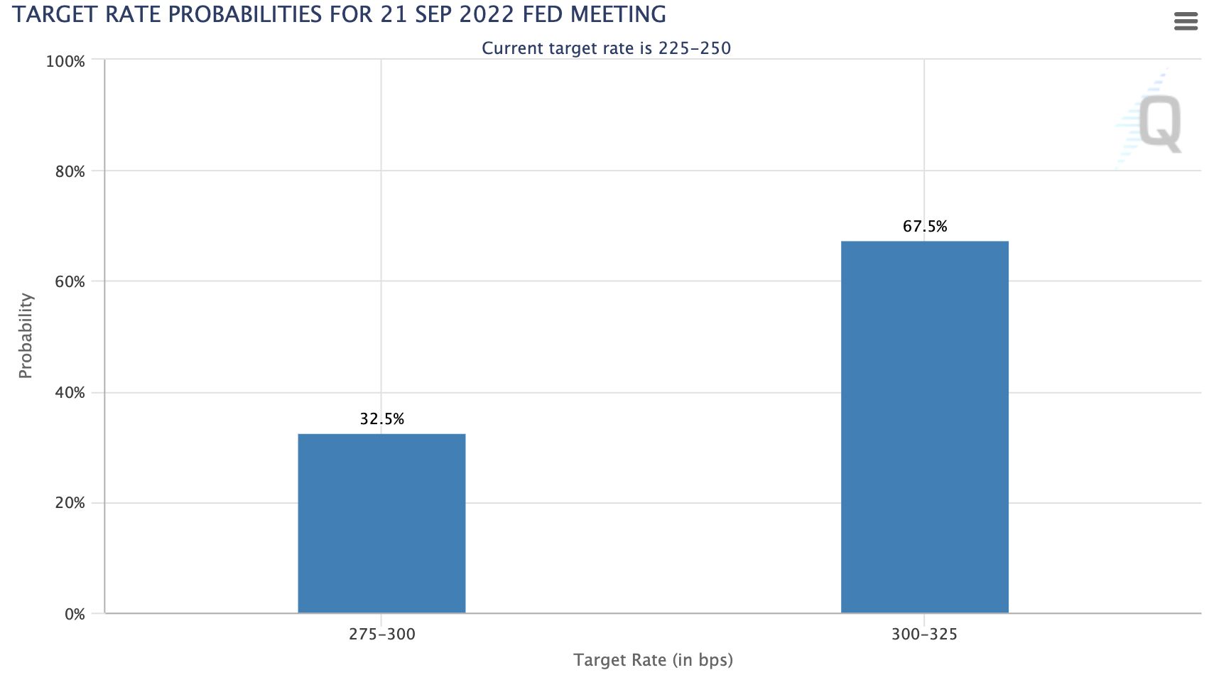 芝加哥商业交易所利率观察工具FedWatch的最新数据显示,超过67%的投资者仍然押注美联储于9月继续加息75个基点,这将是美联储今年累计225个基点之后的第五次加息。