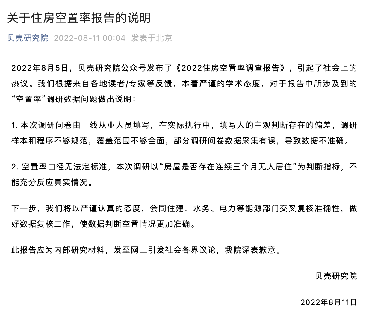 8月11日凌晨,贝壳研究院发布关于住房空置率报告的说明称,本次调研问卷由一线从业人员填写,在实际执行中,填写人的主观判断存在的偏差,调研样本和程序不够规范,覆盖范围不够全面,部分调研问卷数据采集有误,导致数据不准确。空置率口径无法定标准,本次调研以“房屋是否存在连续三个月无人居住”为判断指标,不能充分反应真实情况。