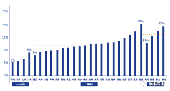 西安、青岛、南京、宁波、长沙、成都、杭州、东莞、沈阳、昆明、郑州、合肥、无锡等11个城市10-15%。还有6个城市超过15%:武汉、重庆、南昌、南通、佛山、廊坊。