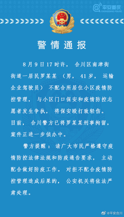 据上游新闻消息,平安合川发布警情通报称,8月9日17时许,合川区南津街道一居民罗某某(男,41岁,运输企业驾驶员)不配合所居住小区疫情防控管理,与小区门口保安和疫情防控志愿者发生争执,将保安殴打致轻伤。目前,合川警方已将罗某某刑事拘留,案件正进一步侦办中。