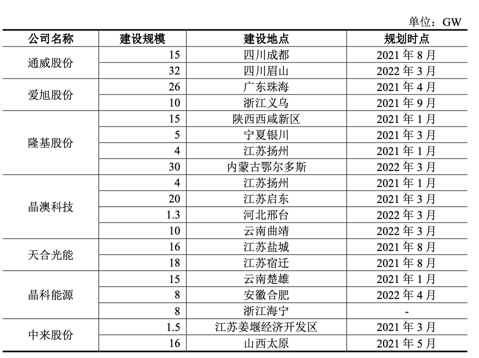 关于光伏电池片产能未来是否过剩饱受争议,但基于对行业的乐观估计,光伏产业链各个环节集中建设、加速扩产。根据公开披露数据,2022年开始,光伏行业已规划或在建电池片产能达约255GW,具体厂商及扩产计划如下: