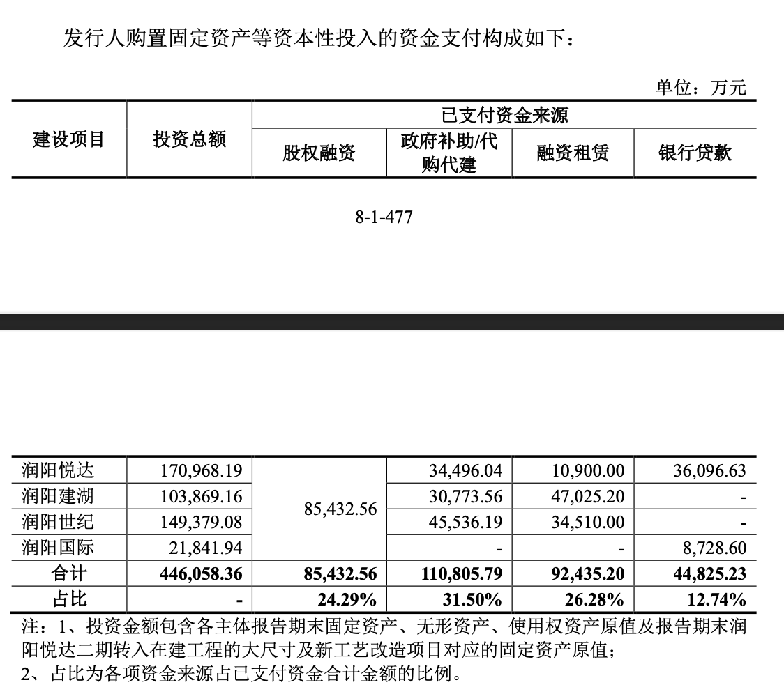 润阳股份也表示不存在单纯依靠借款进行大幅扩张的情形。报告期,公司自投产线的资金总额为446,058.36万元,扣除截至报告期末尚未支付的应付工程设备款94,267.17万元,公司已经支出自投产线的资金合计351,791.19万元。