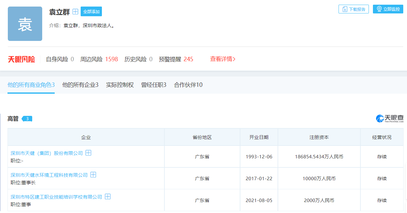 天眼查显示,袁立群在三家企业担任高管,除两家“天健系”公司外,还在深圳市特区建工职业技能培训学校有限公司担任董事。