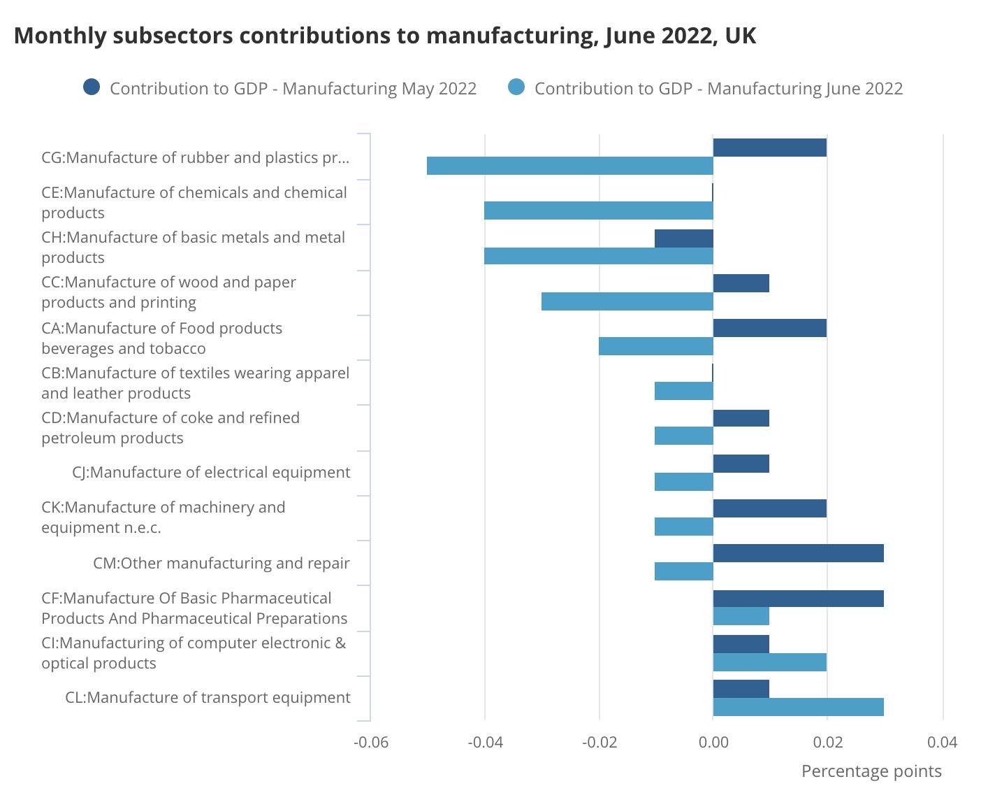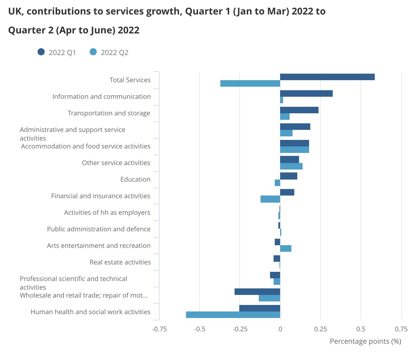 具体而言,服务业产出下滑0.4%,抵消了工业和建筑业产出增长的积极影响。服务业中跌幅最大的分项为疫情管控放开后环比萎缩5.4%的公共卫生和社会活动类产出,住宿和餐饮类产出则环比增长4.7%,尤其是6月初的女王登基70周年庆典刺激了休闲与娱乐类产出的增长(3.3%)。