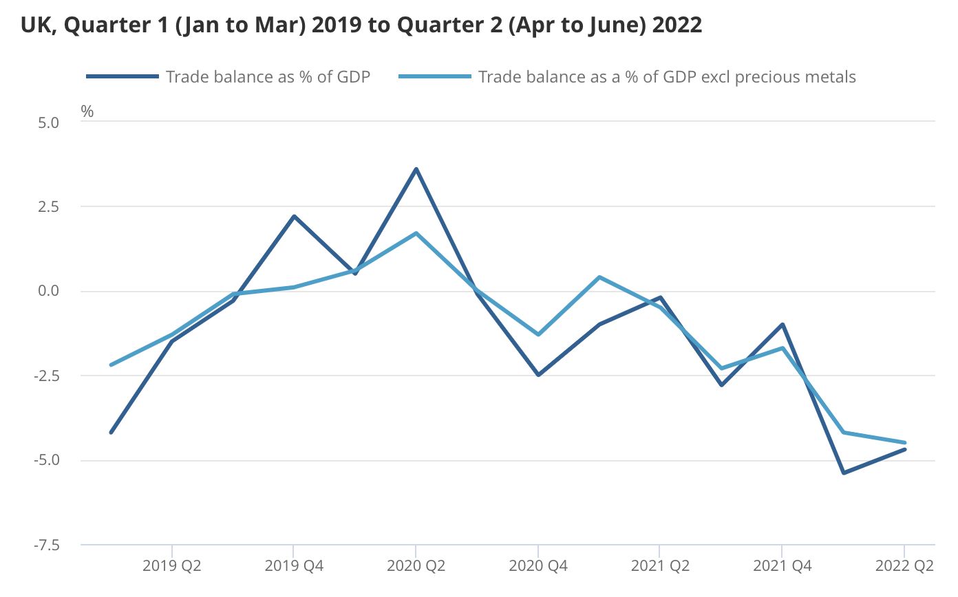 英国的国际贸易收支数据则在继续恶化,不含贵金属的贸易逆差占GDP比重为4.5%,自2021年一季度最近一次季度取得贸易顺差(占GDP比重0.4%)之后,英国已经连续五个季度陷入贸易逆差。今年该国的月度贸易逆差已连续6个月保持在100亿英镑区间。