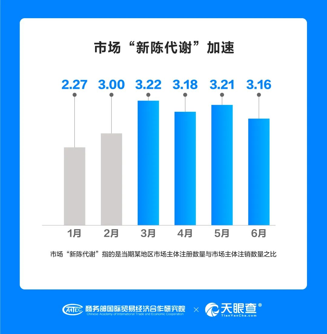 近日,商务部国际贸易经济合作研究院信用研究所联合天眼查发布了《中国市场主体发展活力研究报告(2022年上半年)》,以下简称“报告”。这是继《中国市场主体发展活力研究报告(2011-2020)》和《中国市场主体发展活力研究报告(2021)》之后,双方联合发布的第三份专题研究报告。