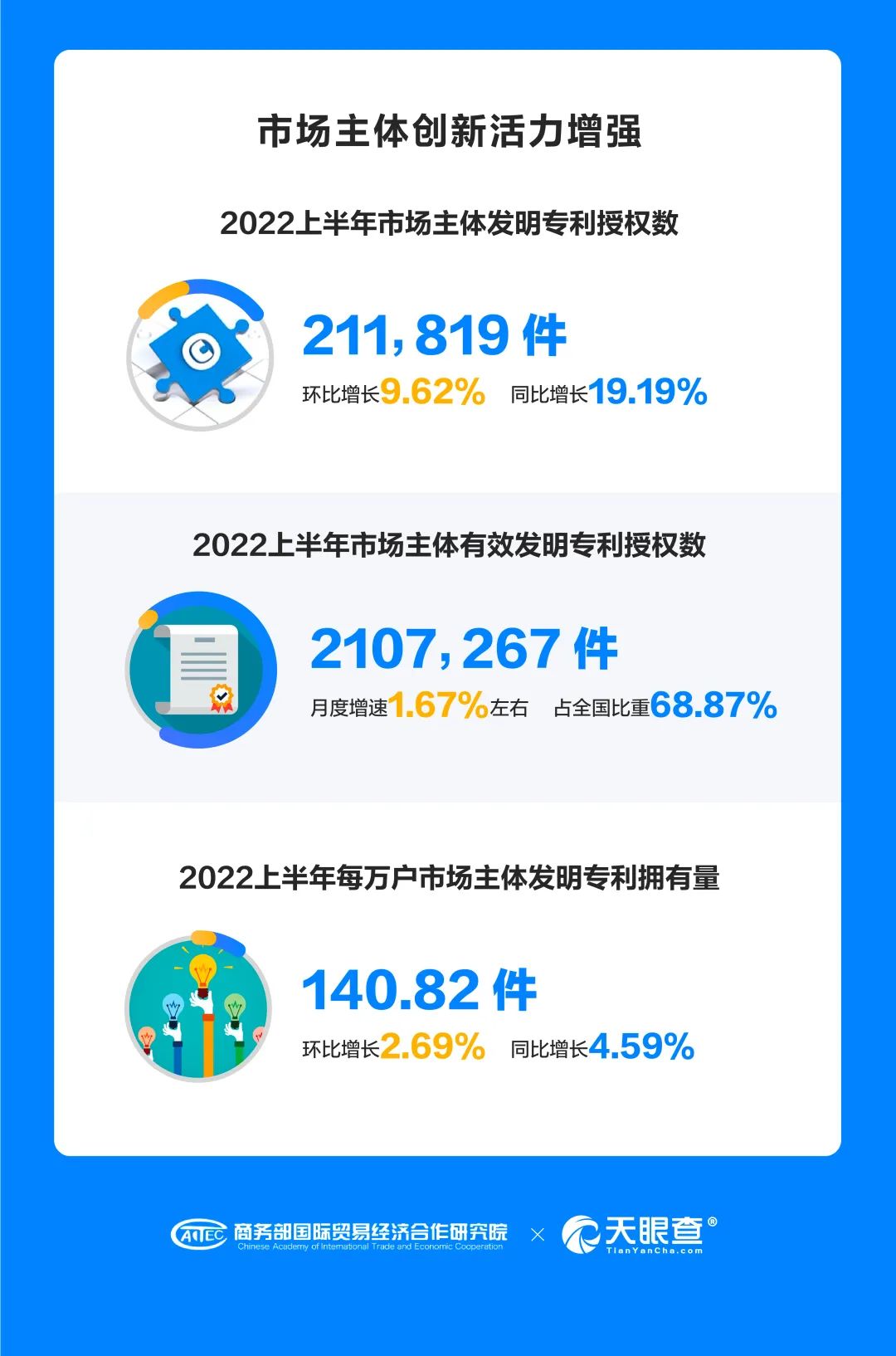 上半年,我国市场主体的创新创造活力显著增强,有效发明专利授权数量增长近10%。市场主体有效发明专利数量月度增速基本保持在1.67%左右,占全国有效发明专利的比重稳定保持在68.87%左右。