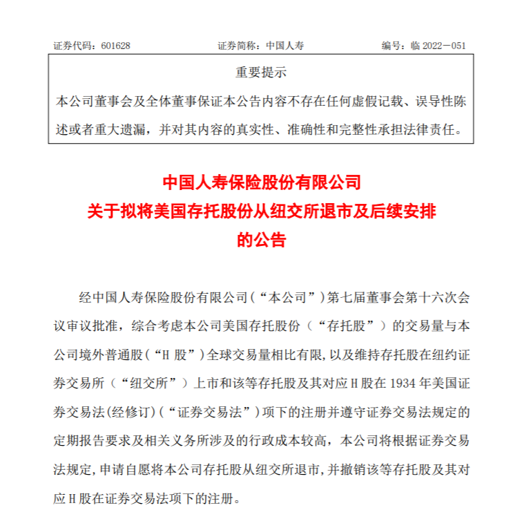8月12日晚间,中国人寿率先发布公告称申请自愿将公司存托股从纽交所退市,并撤销该等存托股及其对应H股在证券交易法项下的注册。随后,中国石化、中国石油、中国铝业、上海石油化工股份公司陆续发布公告称拟将美国存托股份从纽约证券交易所退市。