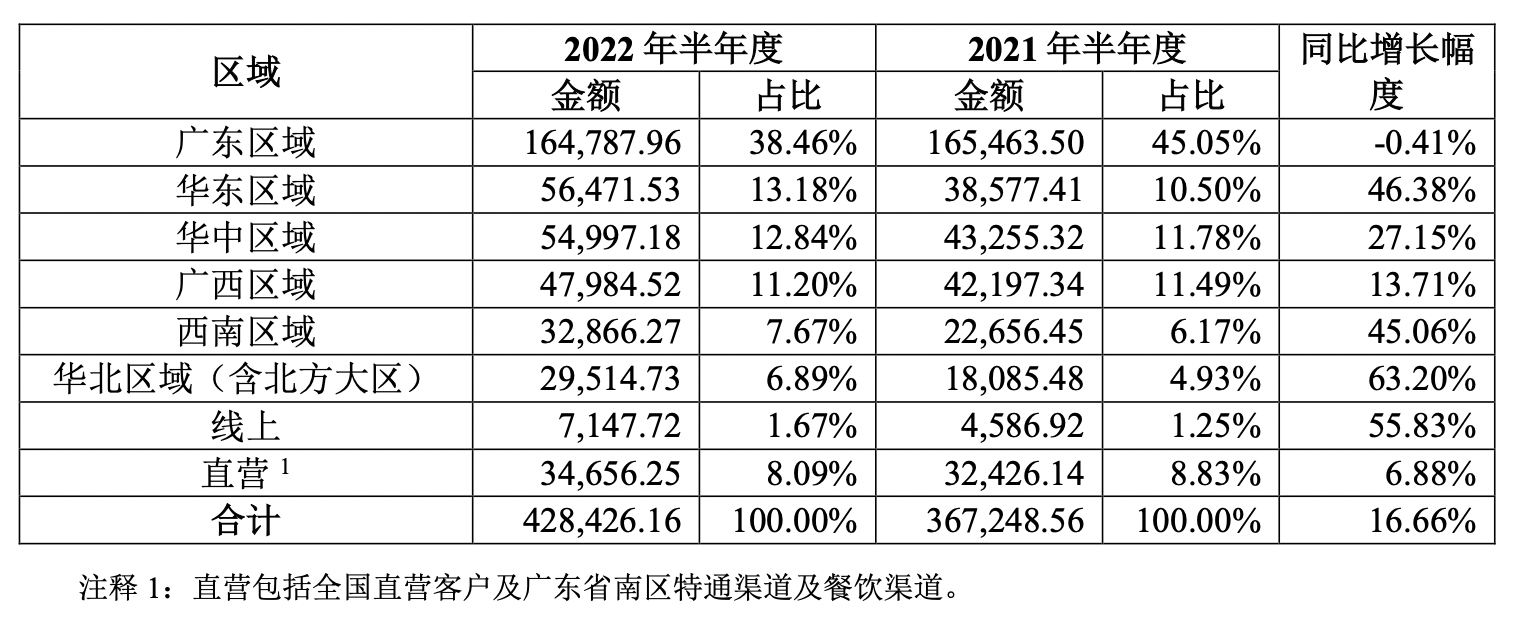 半年报数据显示,全国区域(包含除广东区域、全国直营客户之外的销售区域)销售收入22.18 亿元,同比增长34.63%,营收占比为51.78%,较去年同期增加6.91%——这是全国区域营收占比首次超越了广东区域营收占比。