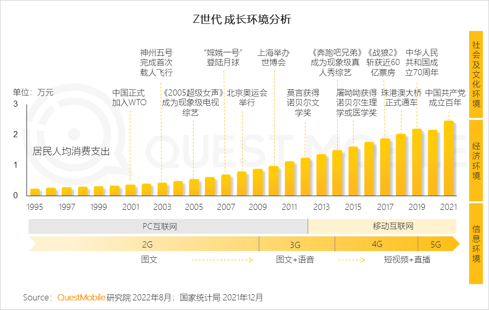 1、随着国内经济及文化的繁荣发展,信息媒介形式的变迁,Z世代拥有着物资及信息更加丰富、文化更加自信的成长环境