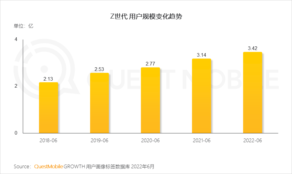 3、Z世代群体随着年龄的增长,正逐步成为社会发展的中坚力量,线上活跃用户规模已达3.42亿