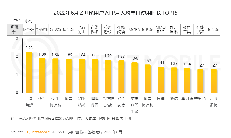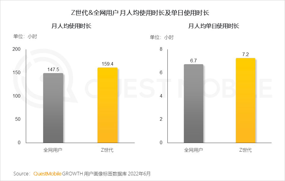 QuestMobile数据显示,2022年6月,Z世代用户月人均使用时长近160小时,月人均单日使用时长7.2小时,明显高于全网平均时长。