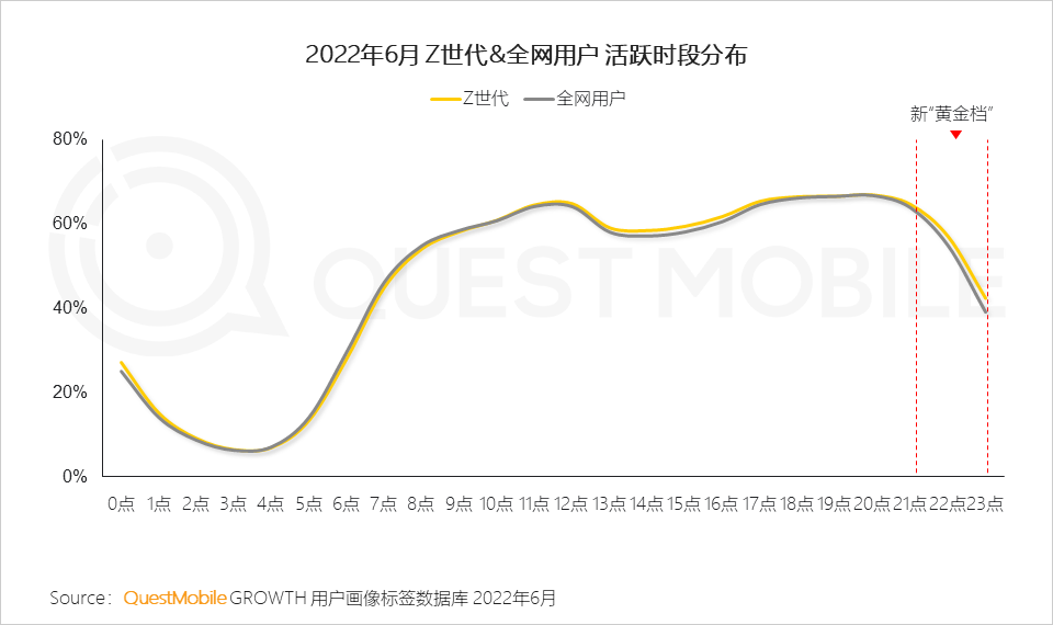 5、移动互联网丰沛资源改变了Z世代用户的时间分配,21点-次日0点的活跃度明显高于全网用户,这种变化趋势或将对信息传播带来深远影响