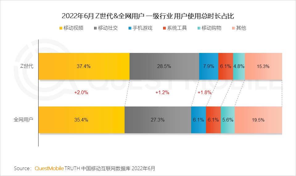 QuestMobile数据显示,移动视频、移动社交及手机游戏行业为Z世代总使用时长占比TOP3行业,且占比均高于全网平均水平。