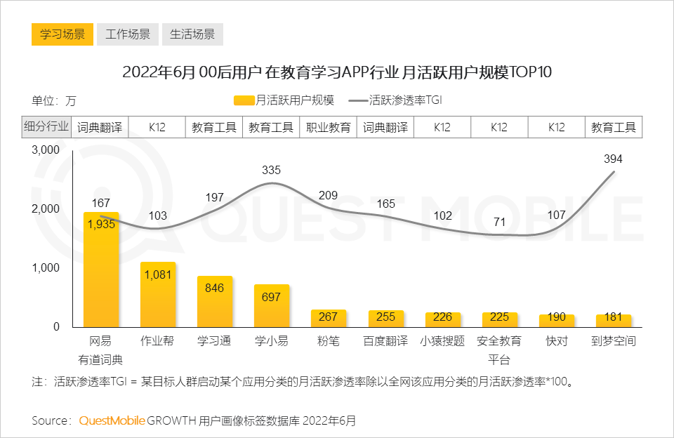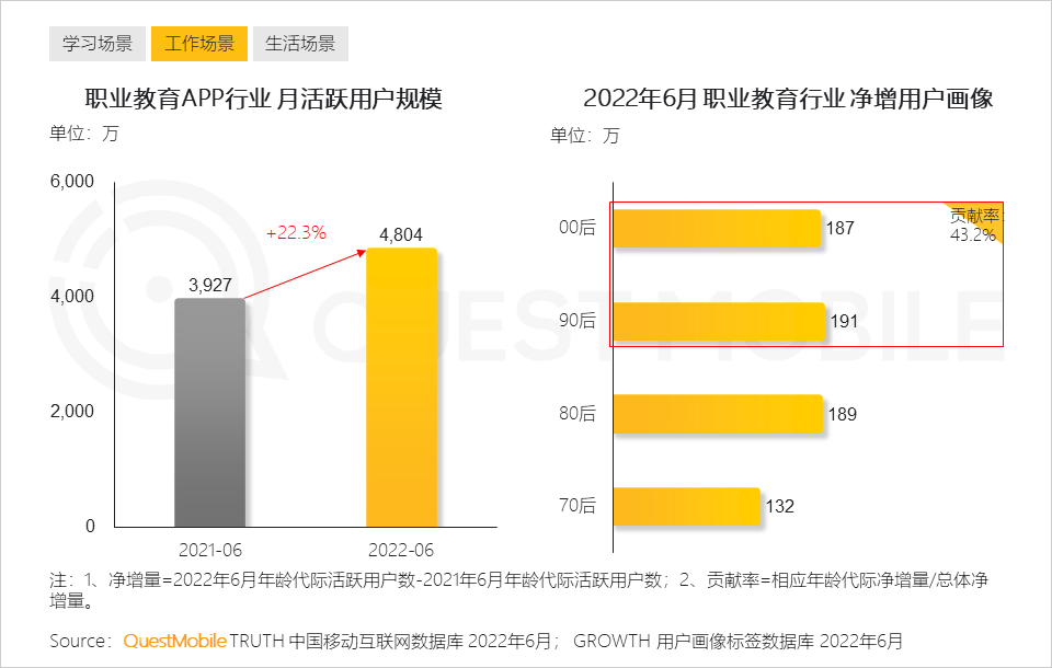 QuestMobile数据显示,职业教育APP行业近一年增量中,00后+90后对于行业整体贡献率达43.2%。
