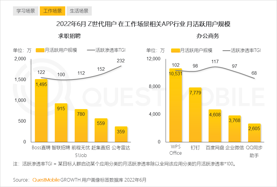1.3 工作场景:随着Z世代陆续步入职场,对求职招聘类应用偏好明显;移动化办公工具为其带来高效办公体验