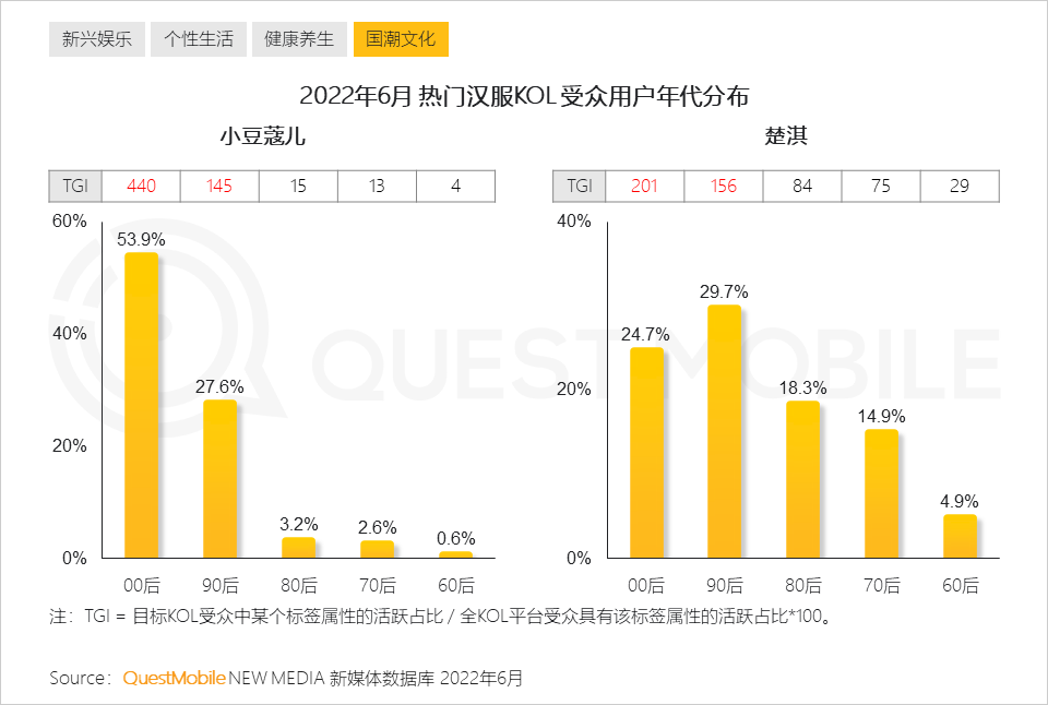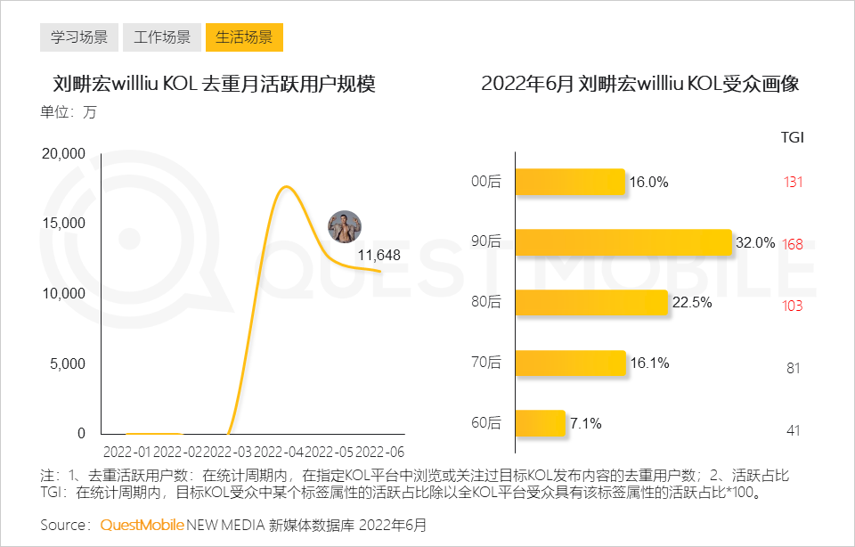QuestMobile数据显示,刘畊宏KOL受众用户中,90后、00后年轻群体占比突出,活跃占比TGI分别达到168和131。