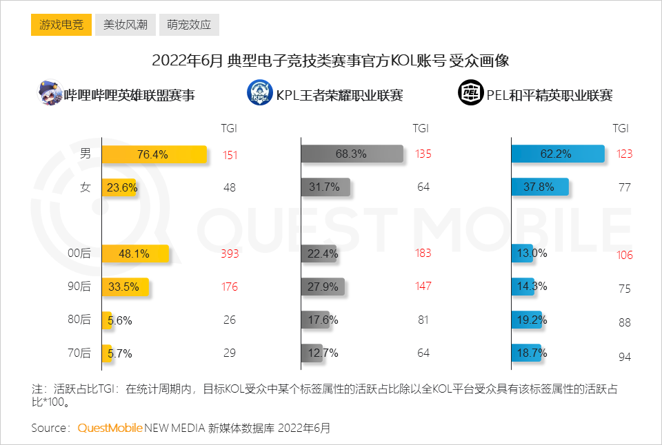 QuestMobile数据显示,英雄联盟、王者荣耀及和平精英电竞赛事内容受众年轻化特征显著,且男性受众占比突出。