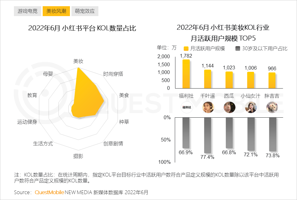 QuestMobile数据显示,美妆类KOL为小红书平台数量占比TOP1类型,吸引年轻用户效果明显,美妆KOL TOP5 30岁及以下年轻用户占比均在60%以上。