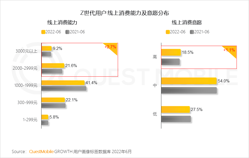 QuestMobile数据显示,Z世代用户线上高消费潜力较大,线上消费能力在2,000元以上的用户占比达到30.8%,同比增长2.7%。
