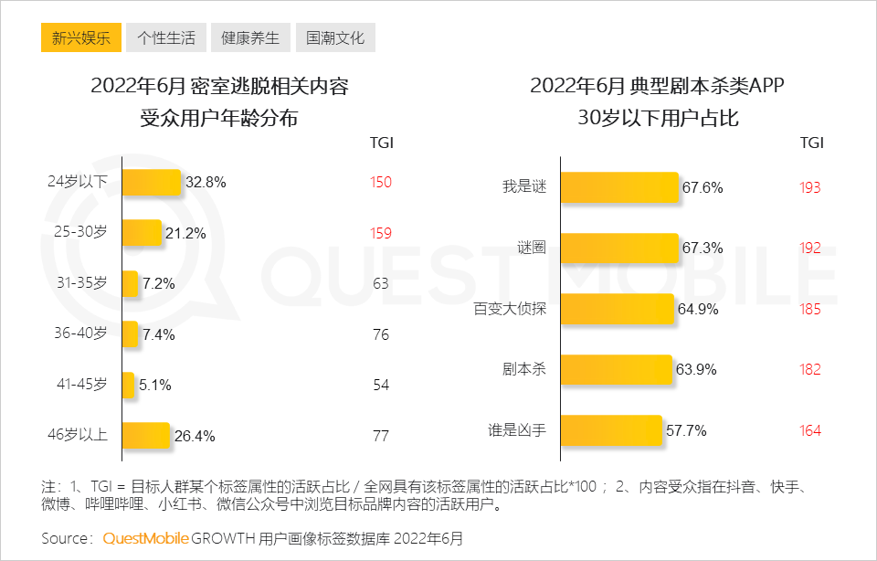 3、新兴娱乐:Z世代对于“代入感”的体验要求更高,密室逃脱、剧本杀的沉浸式场景给予玩家真实的参与感,在带动线下娱乐发展的同时,相应线上APP亦应运而生
