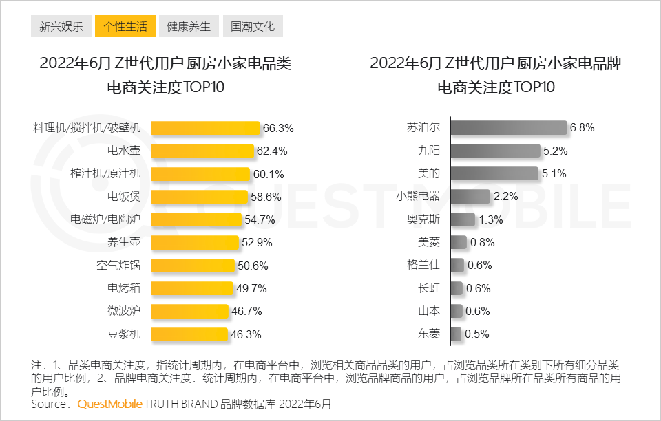 5、Z世代用户追求“小而美”的精致生活,偏好料理机、养生壶、空气炸锅等个性化、功能细分化的产品,苏泊尔、九阳等国货品牌更受关注