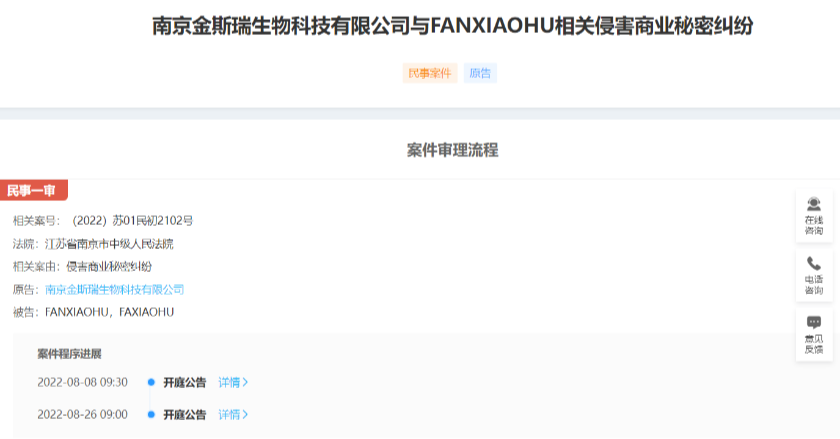 从天眼查上查询可知,金斯瑞生物近日新增一条民事案件信息。该案件原告为金斯瑞生物,被告为FANXIAOHU,案由为侵害商业秘密纠纷,由江苏省南京市中级人民法院审理。目前,该案件已于今年8月8日开庭,还将于8月26日再次开庭。