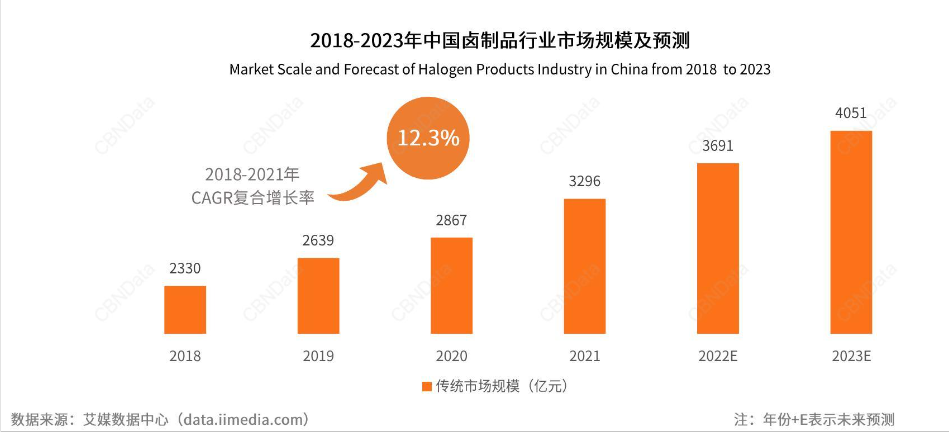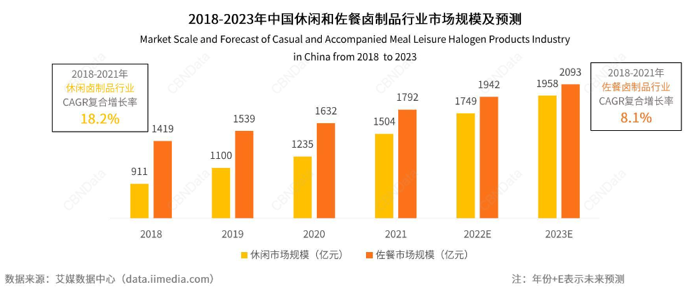 独具风味的卤味让消费者越啃越尽兴,甚至吃出了一个千亿级大市场。根据弗诺斯沙利文的数据,2015~2020年休闲卤制品复合增长率达24.1%,卤制品正成为休闲食品中增速最快的品类。艾媒咨询的数据显示,2018年至2021年,中国卤制品行业规模年复合增长率12.3%,预计2023年将达到4051亿元。