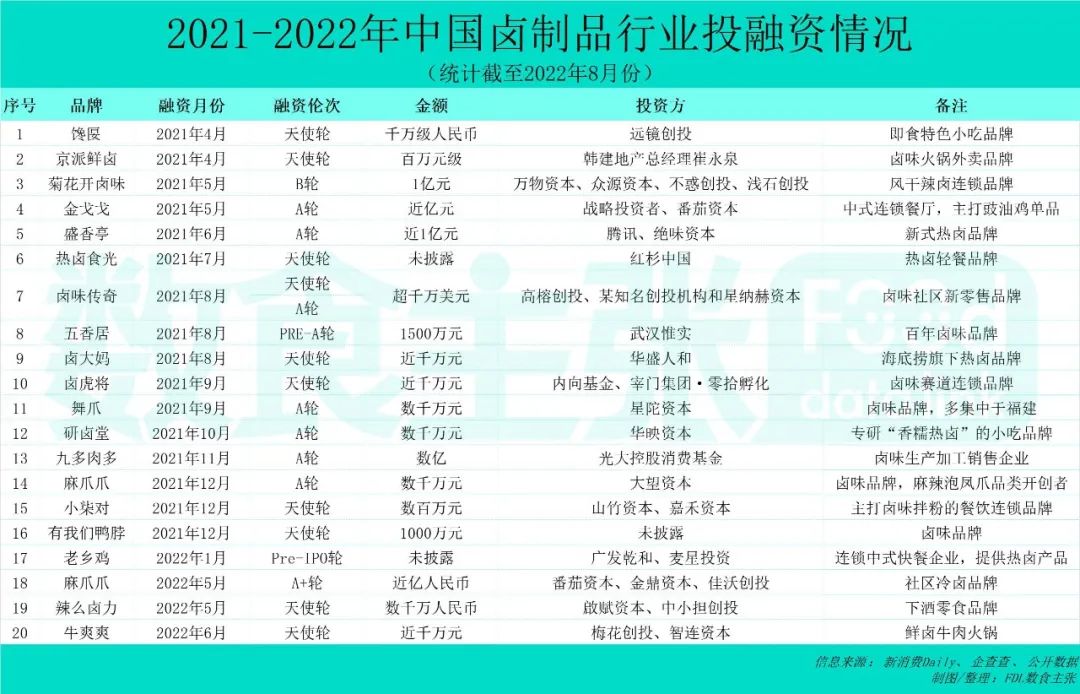 据FDL数食主张不完全统计,自2021至今,就有卤虎将、麻爪爪、菊花开卤味、京派鲜卤、盛香亭、馋匽、研卤堂等在内的20家卤味相关企业相继获得融资,投资方包括腾讯、天图投资、番茄资本、梅花创投等多家知名机构。此外,更多零食品牌如三只松鼠、百草味、良品铺子等也纷纷瞄准时机入局。