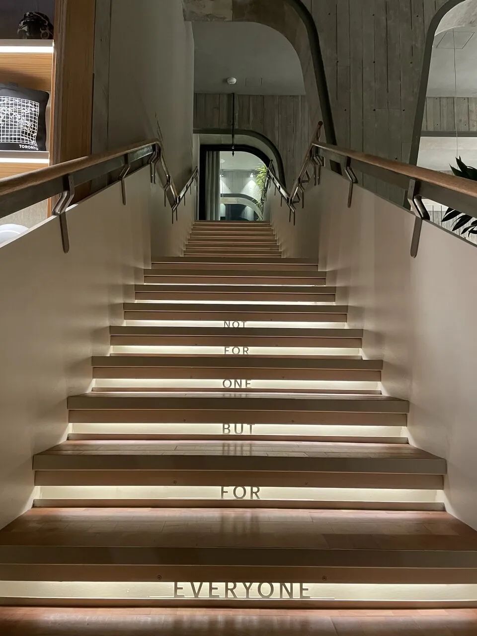 值得一提的是,酒店大堂台阶上还被灯带映上了“Not for one, but for everyone ”,台阶下面一盏独具风格的灯出自设计师之手,让整个空间氛围显得朦胧且独有艺术感,是专属于酒店的独特趣味。