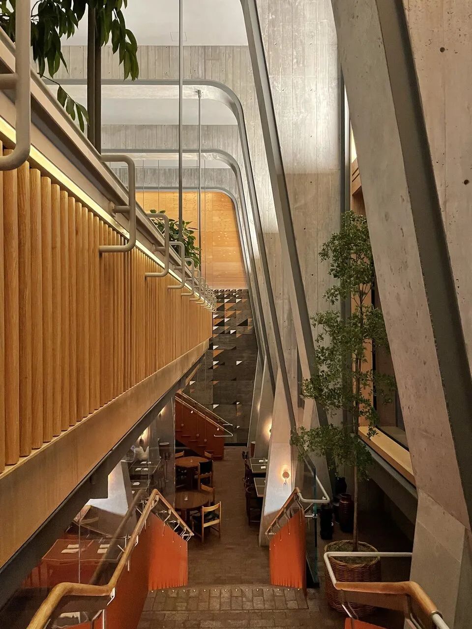 酒店内部巨大的结构混凝土和钢拱重复了相同的形状,大堂区域通过细长的钢棒悬挂,混凝土、木头、钢材料、瓷砖或者胶合板自然融合,搭配上绿植、地毯等元素,整体感觉显得格外温暖、和谐。