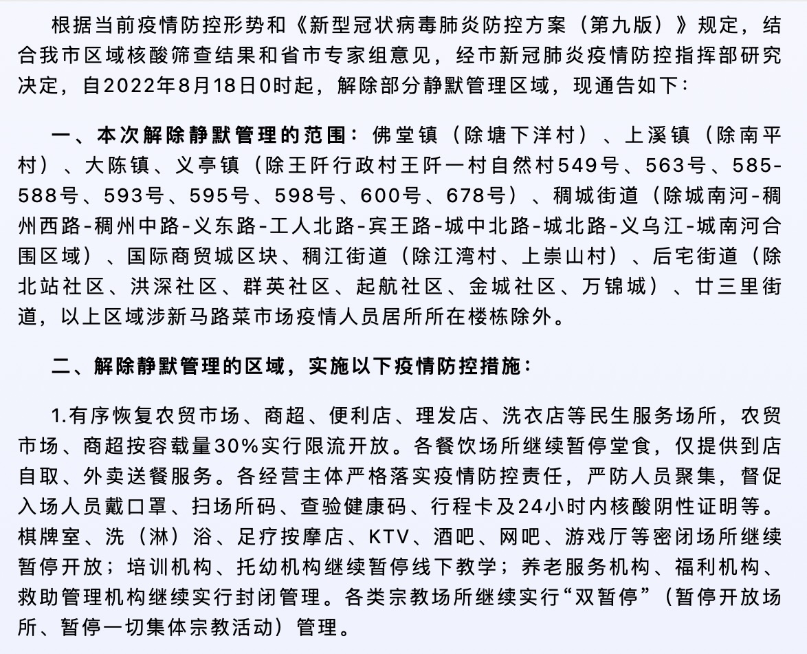 8月17日晚间,义乌市新型冠状病毒肺炎疫情防控指挥部发布了《关于解除义乌市部分区域静默管理的通告》,对包括国际商贸区块等在内的多个地区解除静默管理,部分地区得以恢复正常运营。