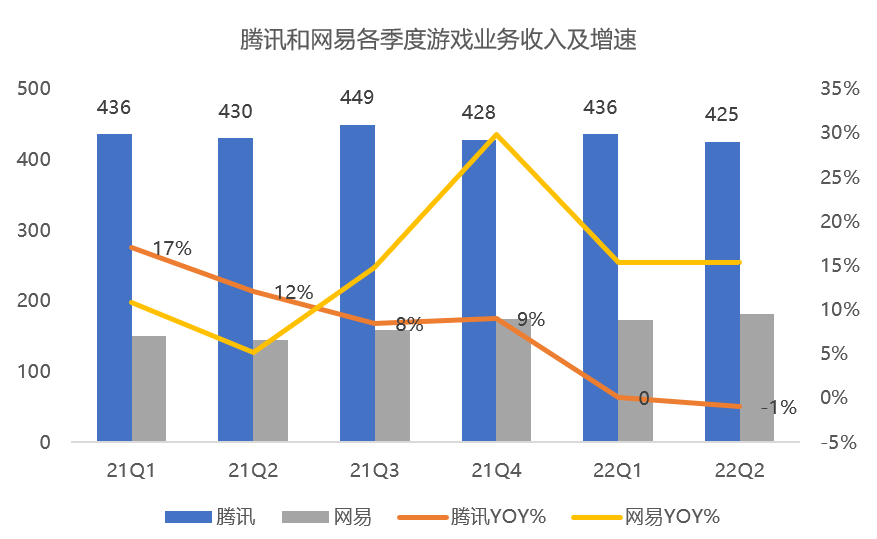 22年上半年,腾讯游戏业务实现收入861亿元,较去年同期(866亿)微跌,其中本土市场游戏收入648亿元,国际市场游戏收入213亿元。而网易上半年游戏收入约354亿元,同比增长20%。