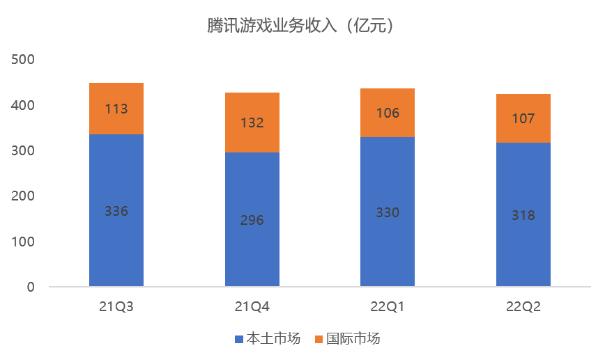 分季度来看,22年Q2,腾讯游戏业务实现收入425亿元,其中本土市场游戏收入下降1%至318亿元,国际市场游戏收入下降1%至107亿元,或以固定汇率计算大致稳定。